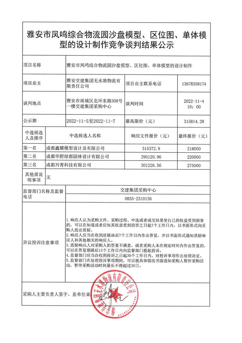 雅安交建集團(tuán)無(wú)水港物流有限責(zé)任公司雅安市鳳鳴綜合物流園沙盤模型、區(qū)位圖、單體模型的設(shè)計(jì)制作競(jìng)爭(zhēng)談判結(jié)果公示