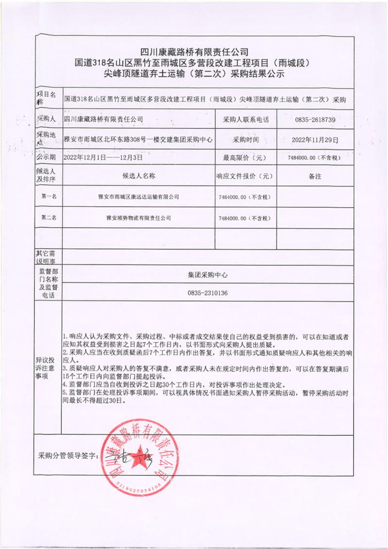 四川康藏路橋有限責(zé)任公司國道318名山區(qū)黑竹至雨城區(qū)多營段改建工程項(xiàng)目(雨城段)尖峰頂隧道棄土運(yùn)輸(第二次)采購結(jié)果公示