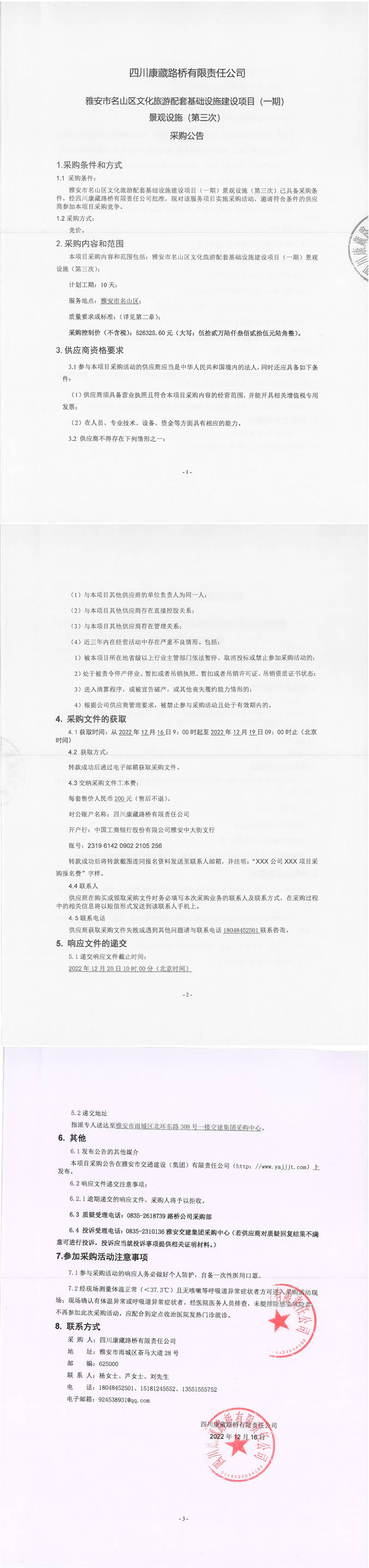 四川康藏路橋有限責(zé)任公司雅安市名山區(qū)文化旅游配套基礎(chǔ)設(shè)施建設(shè)項(xiàng)目(一期)景觀設(shè)施(第三次)采購(gòu)公告