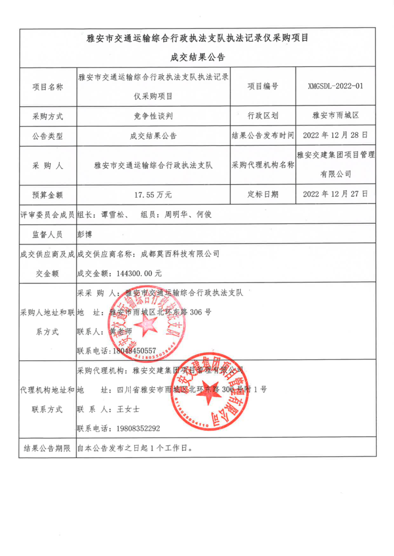 雅安交建集團(tuán)項目管理有限公司雅安市交通運輸綜合行政執(zhí)法支隊執(zhí)法記錄儀采購項目成交結(jié)果公告