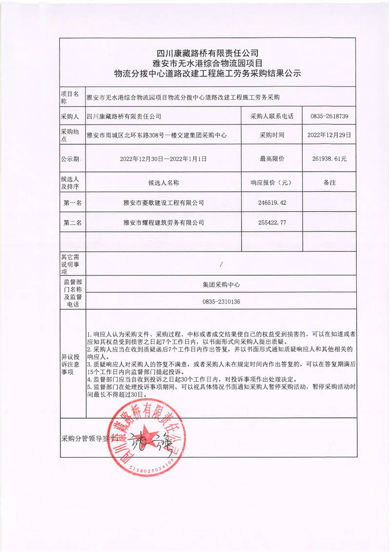 四川康藏路橋有限責(zé)任公司雅安市無水港綜合物流園項(xiàng)目物流分撥中心道路改建工程施工勞務(wù)采購結(jié)果公示