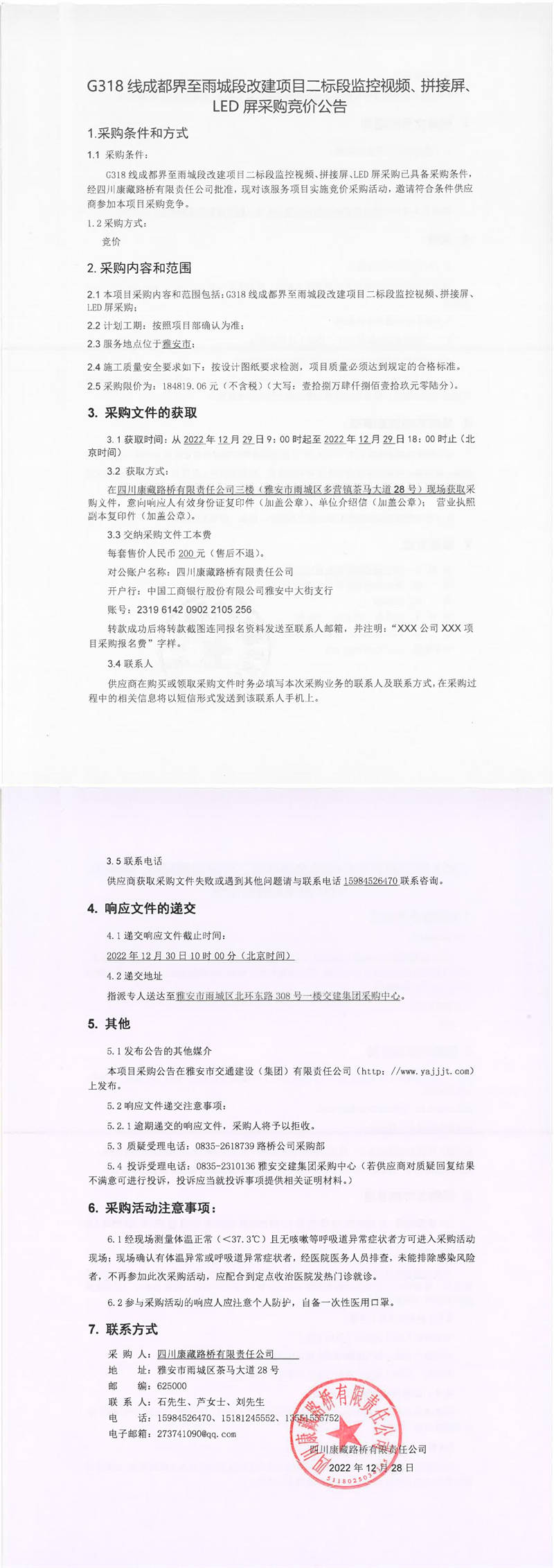 四川康藏路橋有限責任公司G318線成都界至雨城段改建項目二標段監(jiān)控視頻、拼接屏、LED屏采購競價公告