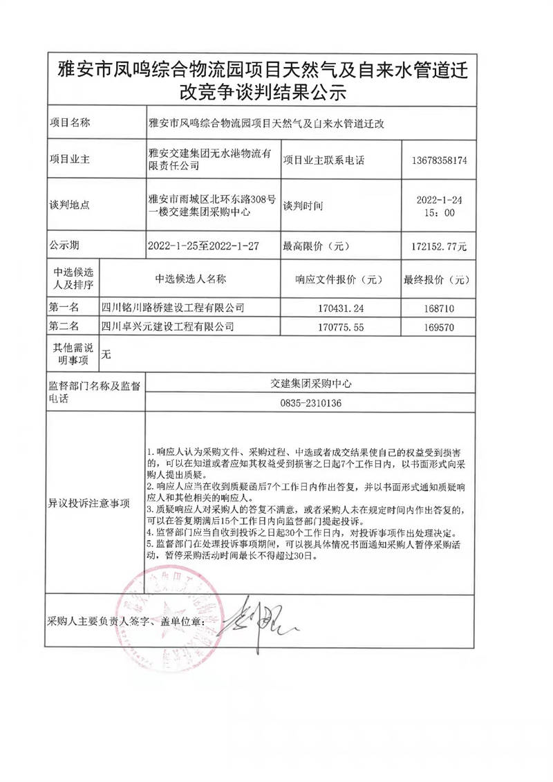 雅安交建集團(tuán)無水港物流有限責(zé)任公司雅發(fā)市鳳鳴綜合物流園項目天然氣及自來水管道遷改競爭談判結(jié)果公示