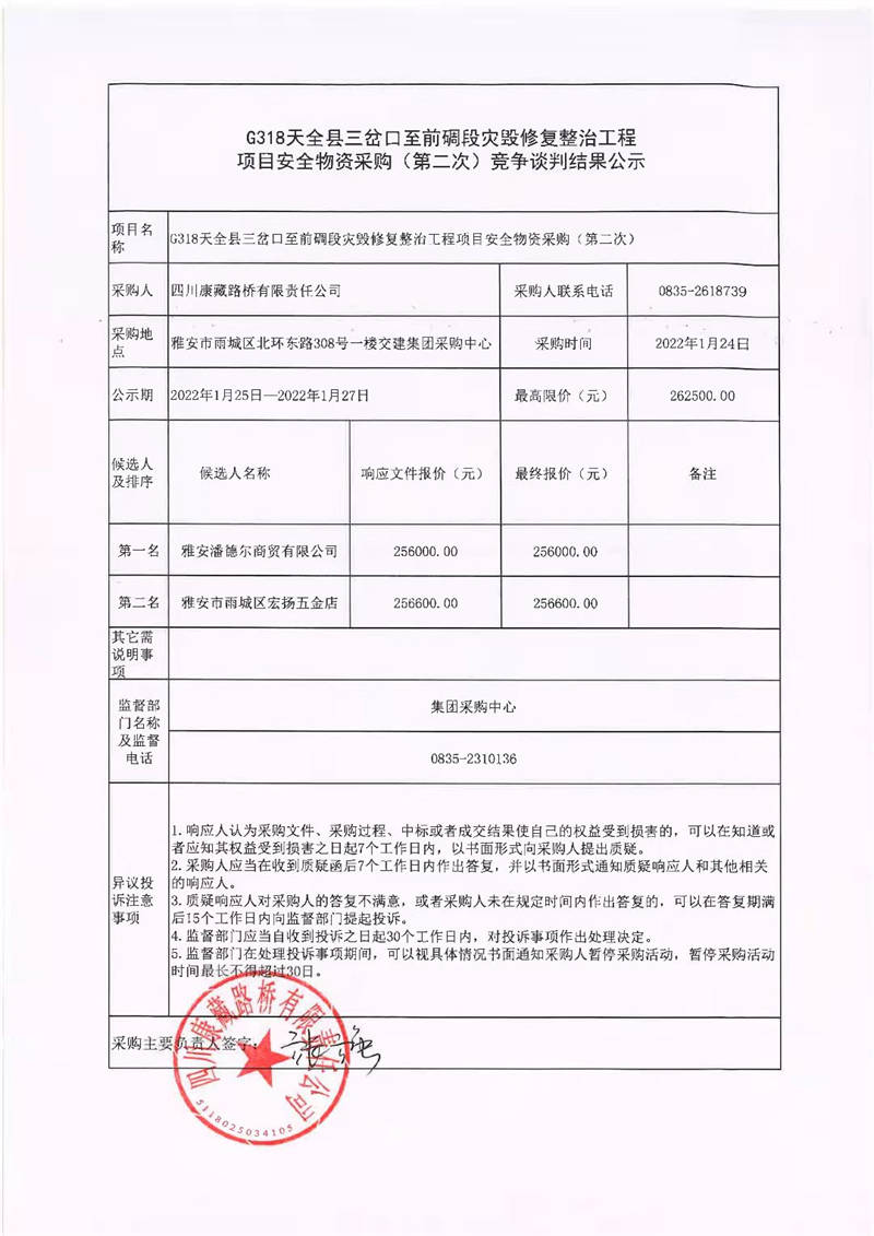 四川康藏路橋有限責任公司G318天全縣三岔口至前碉段災毀修復整治工程項目安全物資采購(第二次)競爭談判結(jié)果公示