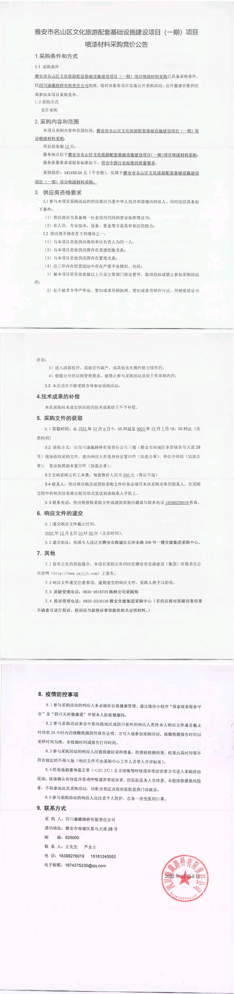 四川康藏路橋有限責(zé)任公司雅安市名山區(qū)文化旅游配套基礎(chǔ)設(shè)施建設(shè)項(xiàng)目(一期)項(xiàng)目噴漆材料采購競(jìng)價(jià)公告