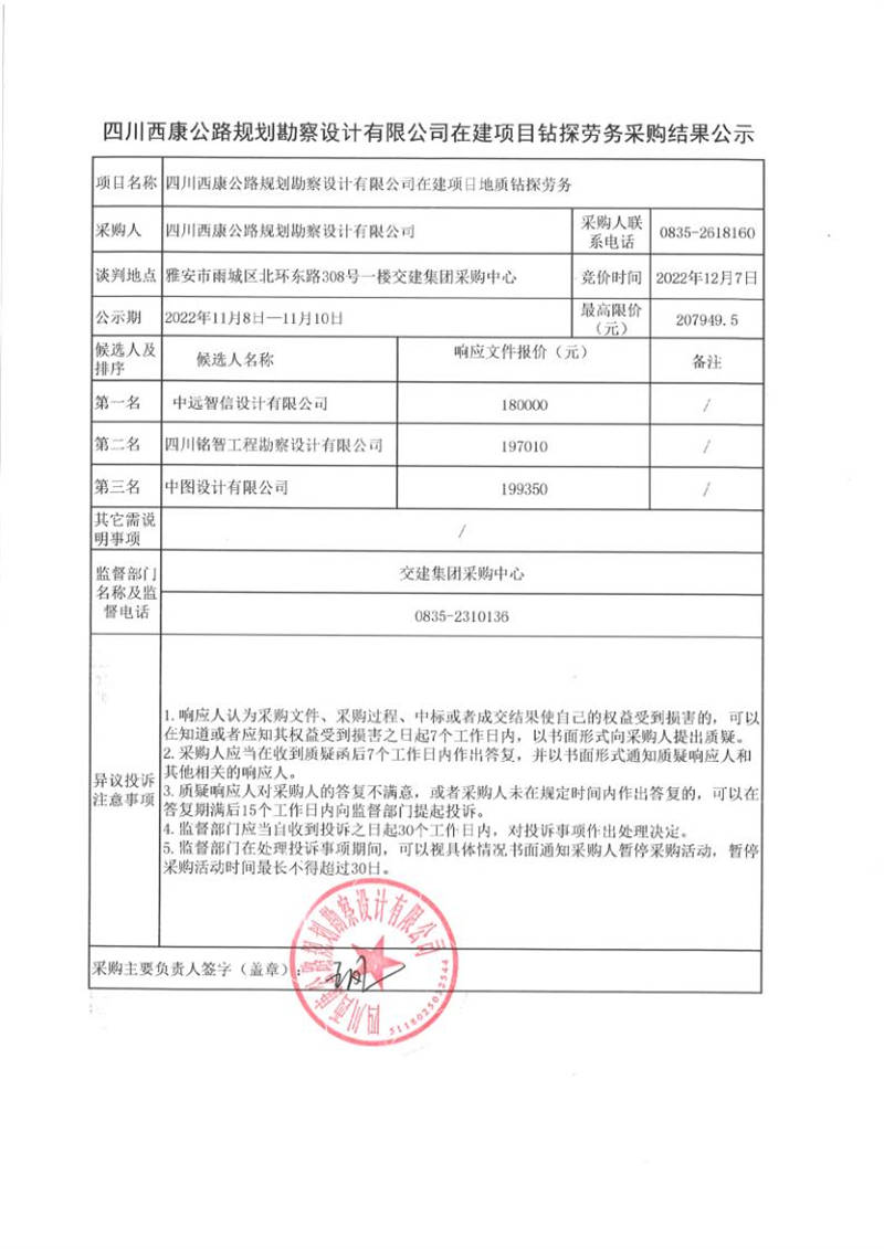 四川西康公路規(guī)劃勘察設(shè)計(jì)有限公司在建項(xiàng)目地質(zhì)鉆探勞務(wù)采購(gòu)結(jié)果公示