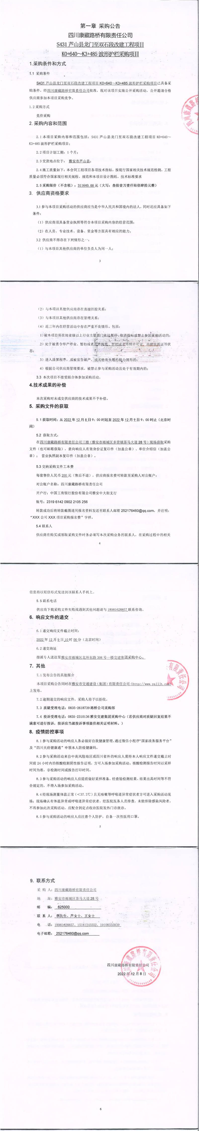 四川康藏路橋有限責任公司S431蘆山縣龍門鎮(zhèn)至雙石段改建工程項目K0+640-K3+485波形護欄采購項目采購公告
