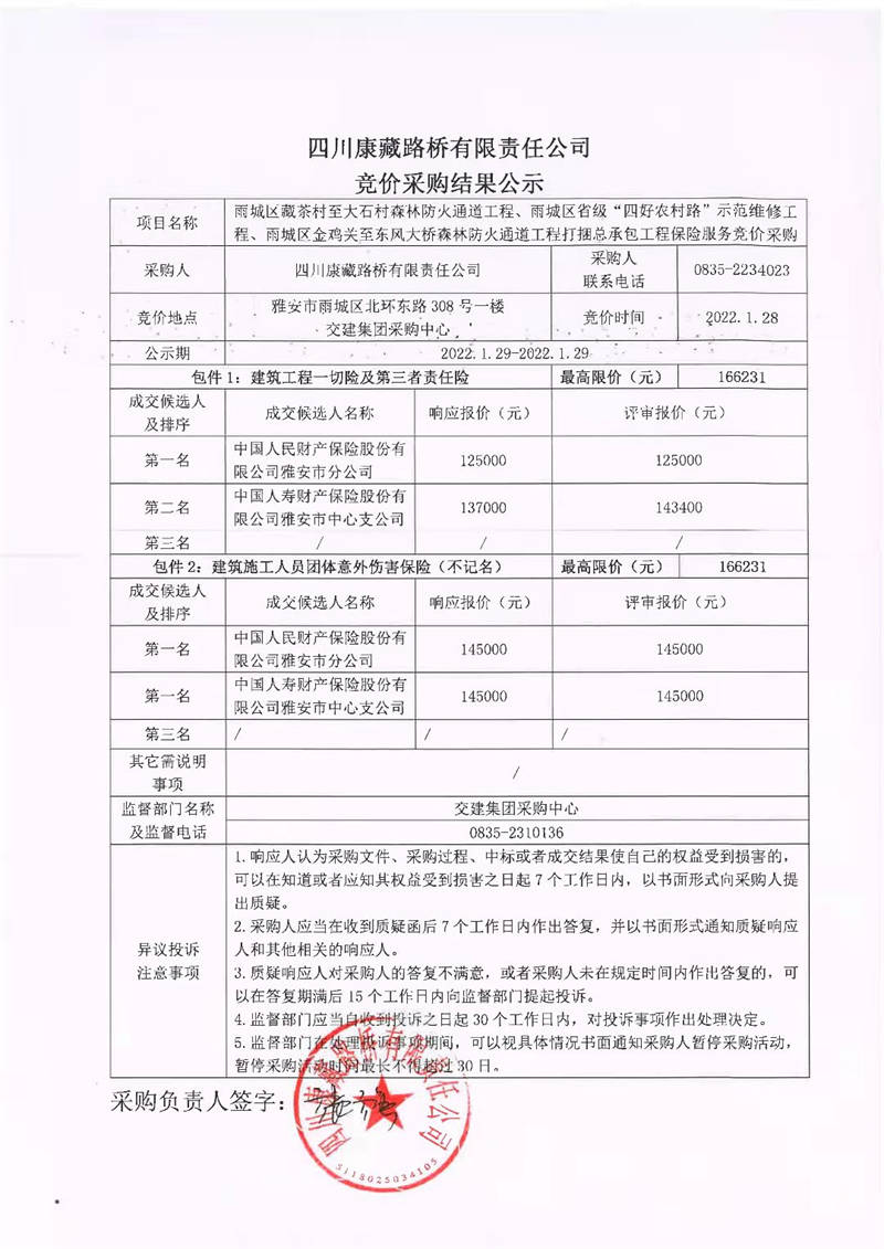 四川康藏路橋有限責任公司雨城區(qū)藏茶村至大石村森林防火通道工程、雨城區(qū)省級“四好農(nóng)村路”示范維修工程、雨城區(qū)金雞關至東風大橋森林防火通道工程打捆總承包工程保險服務競價采購結果公示
