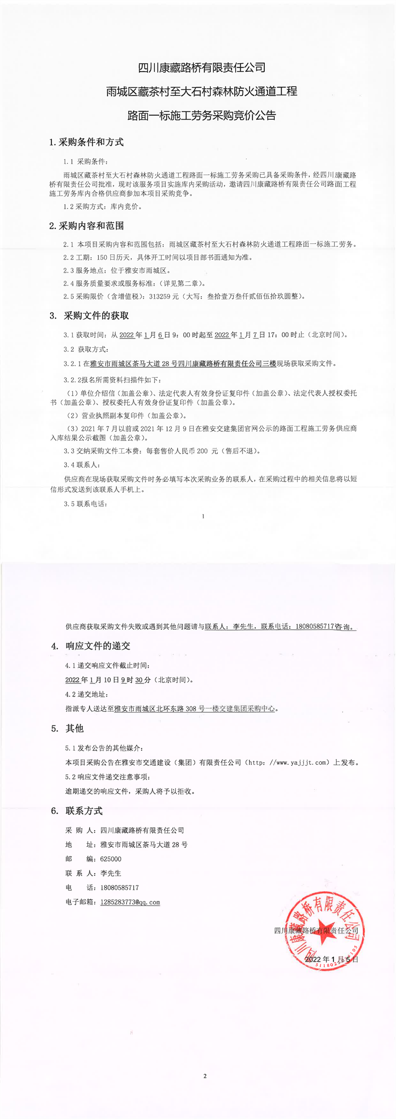四川康藏路橋有限責任公司雨城區(qū)藏茶村至大石村森林防火通道工程路面一標施工勞務采購競價公告
