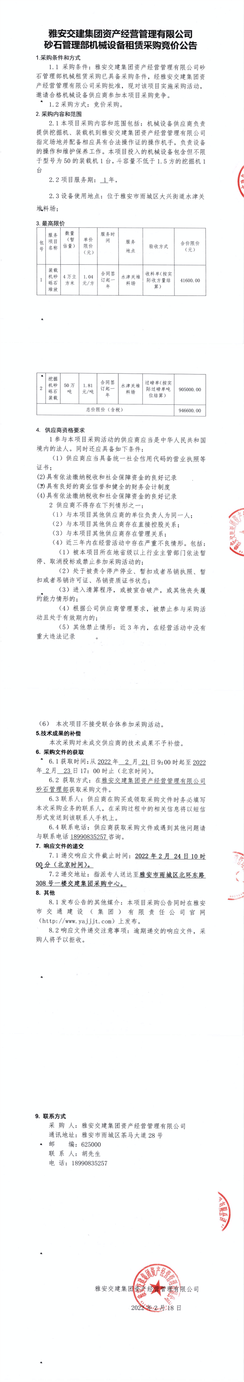 雅安交建集團(tuán)資產(chǎn)經(jīng)營管理有限公司砂石管理部機(jī)械設(shè)備租賃采購競價(jià)公告