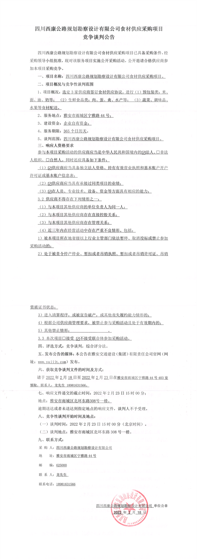 四川西康公路規(guī)劃勘察設(shè)計(jì)有限公司食材供應(yīng)采購項(xiàng)目競(jìng)爭(zhēng)談判公告