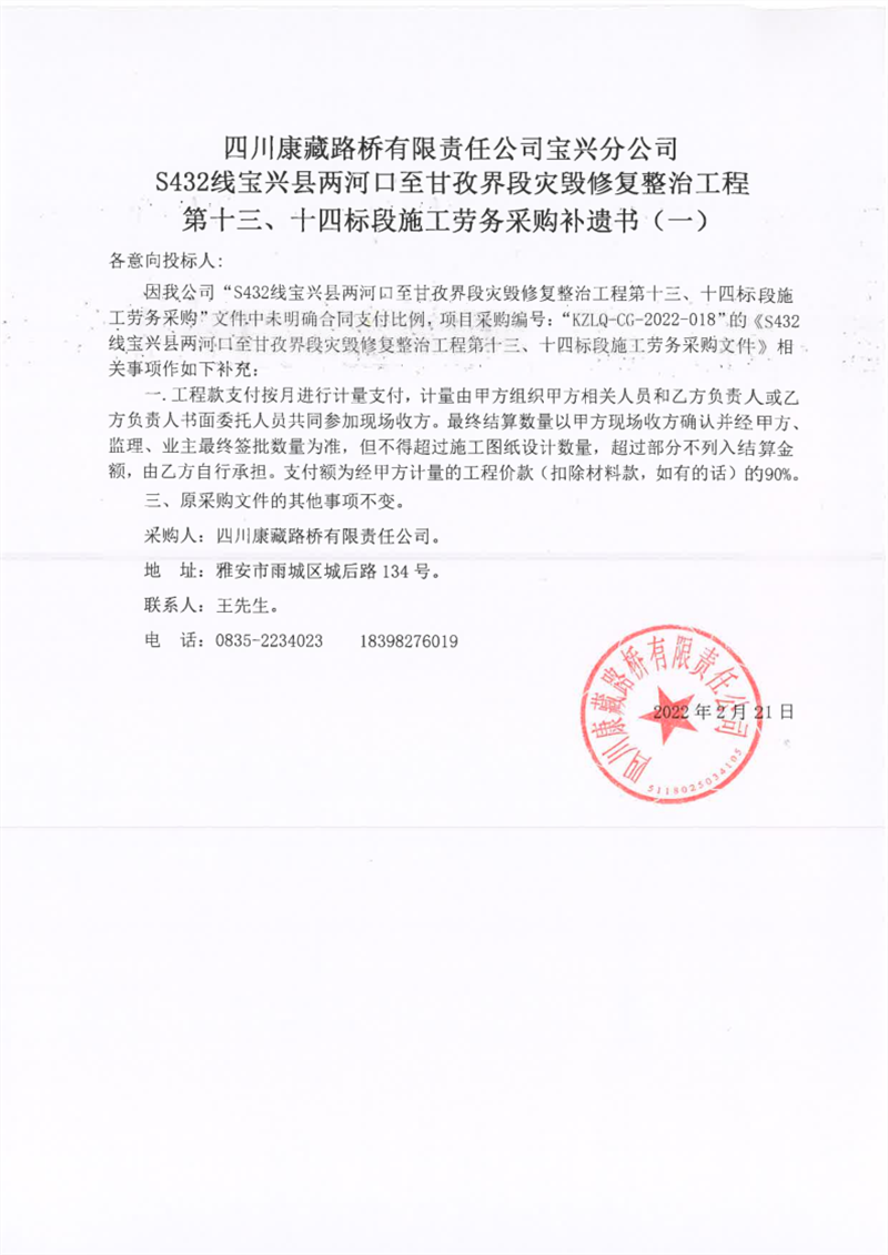 四川康藏路橋有限責(zé)任公司寶興分公司S432線寶興縣兩河口至甘孜界段災(zāi)毀修復(fù)整治工程第十三、十四標(biāo)段施工勞務(wù)采購補遺書(一)