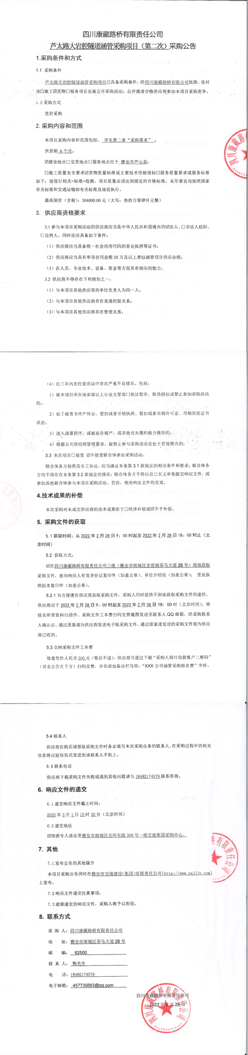 四川康藏路橋有限責(zé)任公司蘆太路大巖腔隧道涵管采購項目(第二次)采購公告