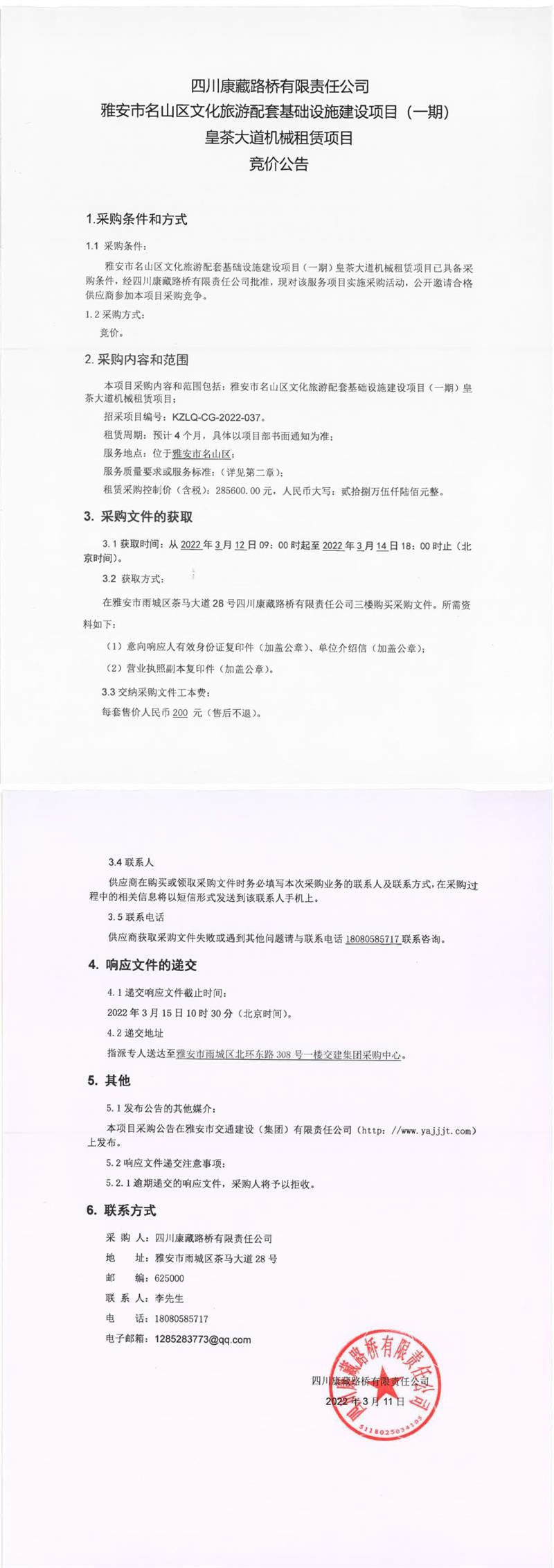 四川康藏路橋有限責(zé)任公司雅安市名山區(qū)文化旅游配套基礎(chǔ)設(shè)施建設(shè)項(xiàng)目(一期)皇茶大道機(jī)械租賃項(xiàng)目競價公告
