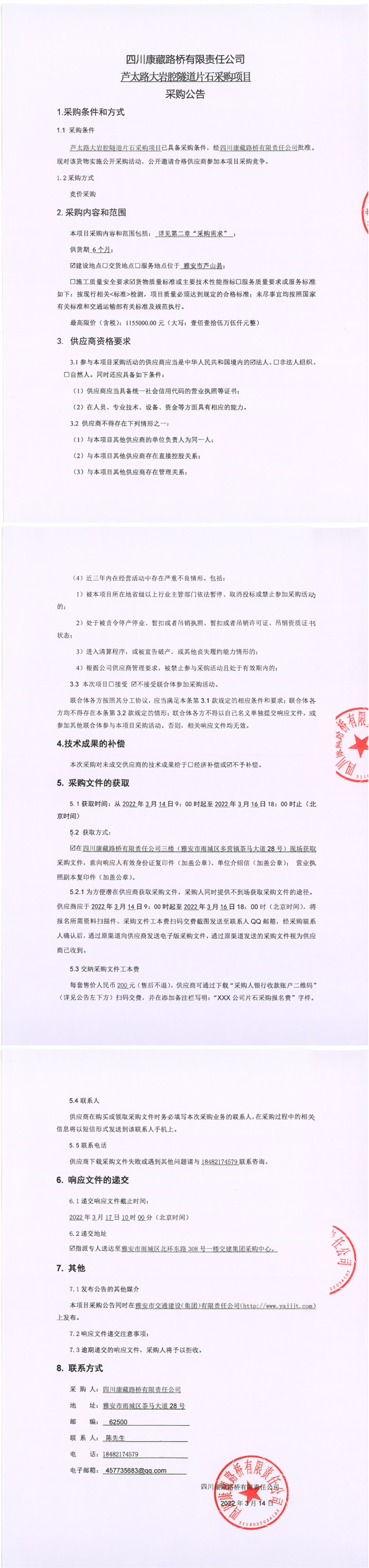 四川康藏路橋有限責(zé)任公司蘆太路大巖腔隧道片石采購項目采購公告