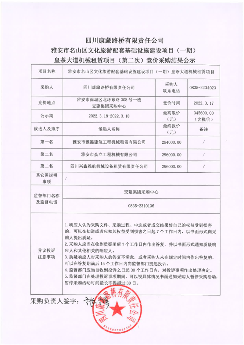 四川康藏路橋有限責(zé)任公司雅安市名山區(qū)文化旅游配套基礎(chǔ)設(shè)施建設(shè)項(xiàng)目(一期)皇茶大道機(jī)械租賃項(xiàng)目(第二次)競(jìng)價(jià)采購結(jié)果公示
