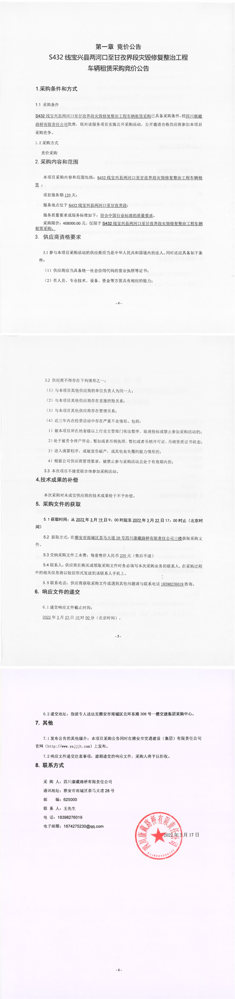 四川康藏路橋有限責(zé)任公司S432線寶興縣兩河口至甘孜界段災(zāi)毀修復(fù)整治工程車輛租賃采購競價公告