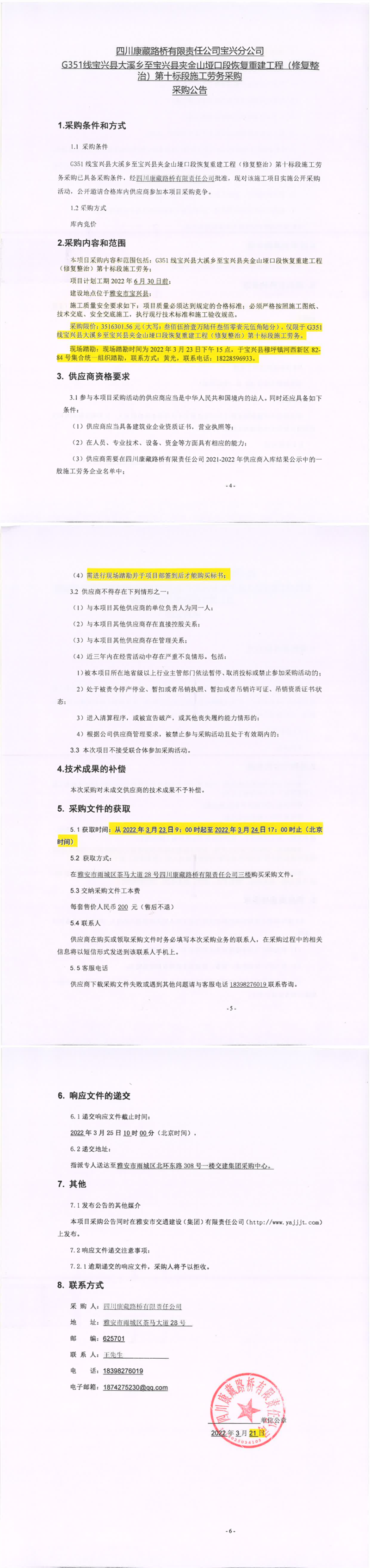 四川康藏路橋有限責任公司寶興分公司G351線寶興縣大溪鄉(xiāng)至寶興縣夾金山埡口段恢復重建工程(修復整治)第十標段施工勞務采購采購公告