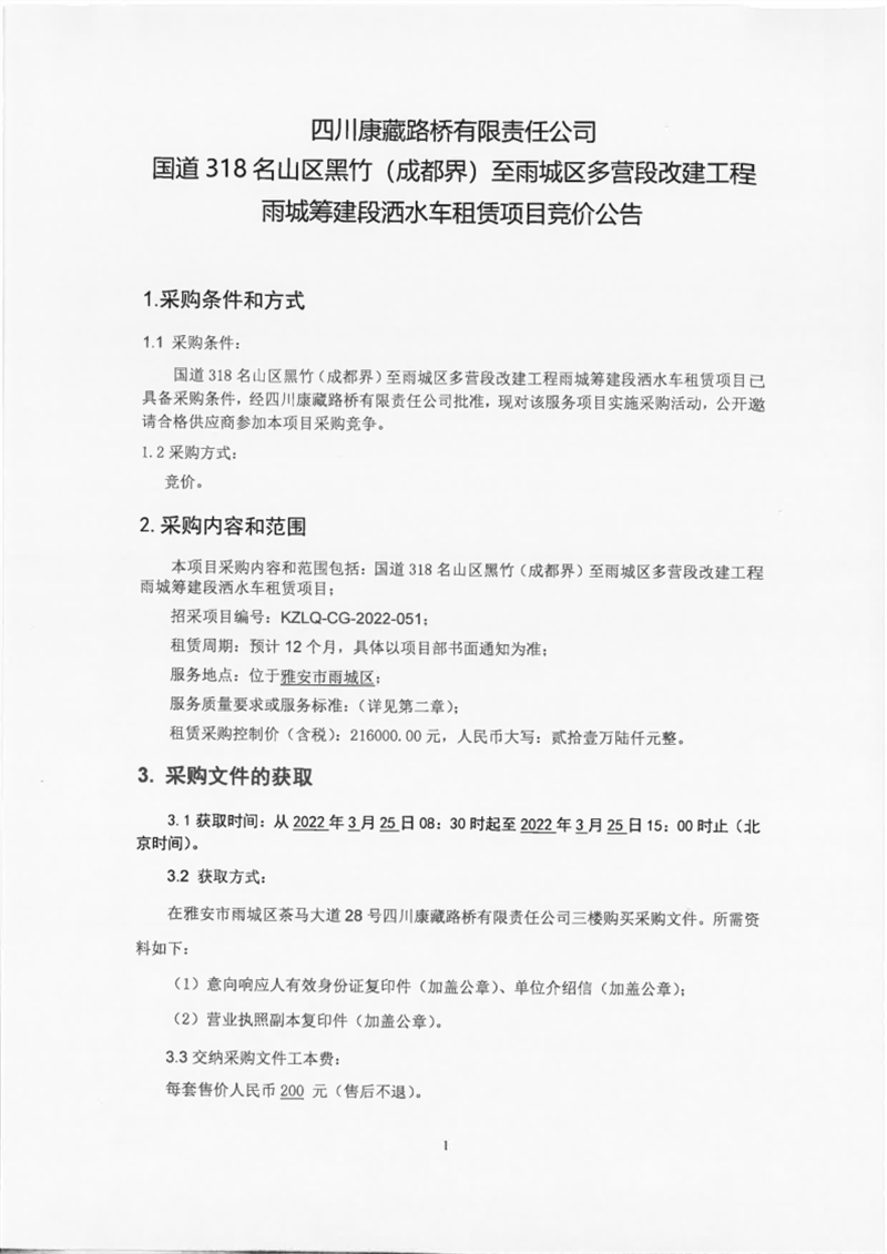 四川康藏路橋有限責(zé)任公司國道318名山區(qū)黑竹(成都界)至雨城區(qū)多營(yíng)段改建工程雨城籌建段灑水車租賃項(xiàng)目競(jìng)價(jià)公告