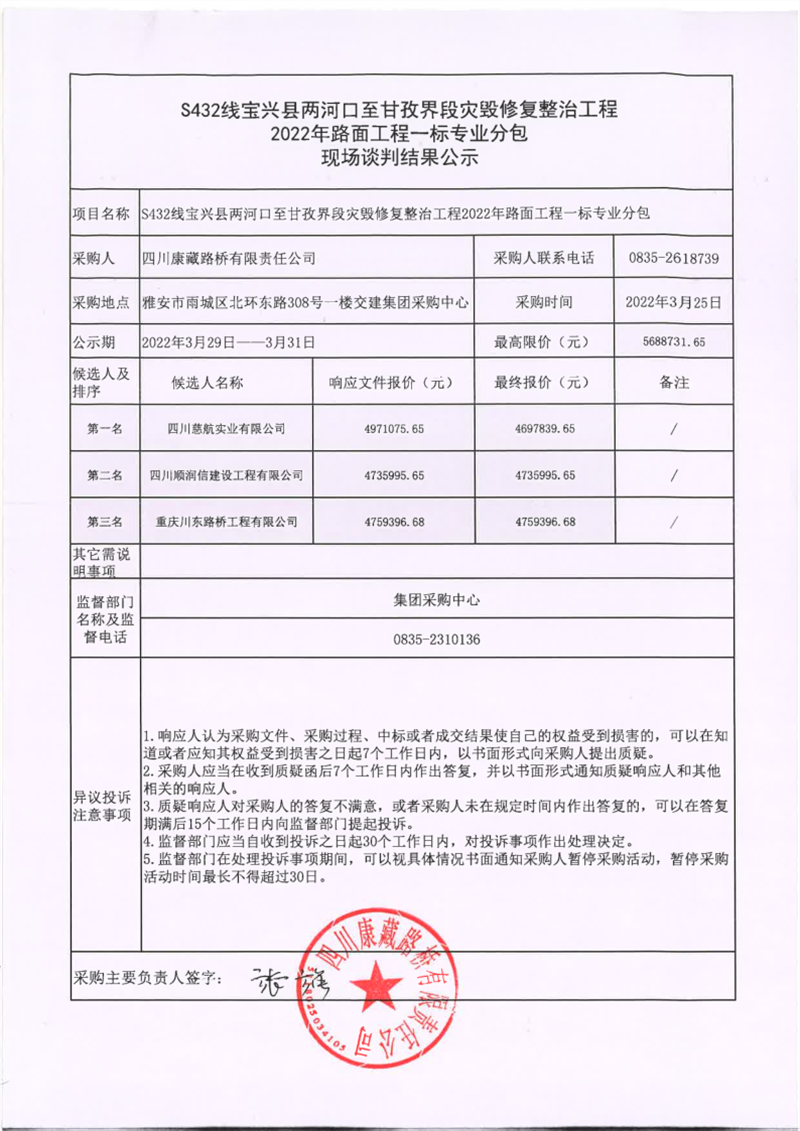 四川康藏路橋有限責(zé)任公司S432線寶興縣兩河口至甘孜界段災(zāi)毀修復(fù)整治工程2022年路面工程一標(biāo)專業(yè)分包現(xiàn)場(chǎng)談判結(jié)果公示
