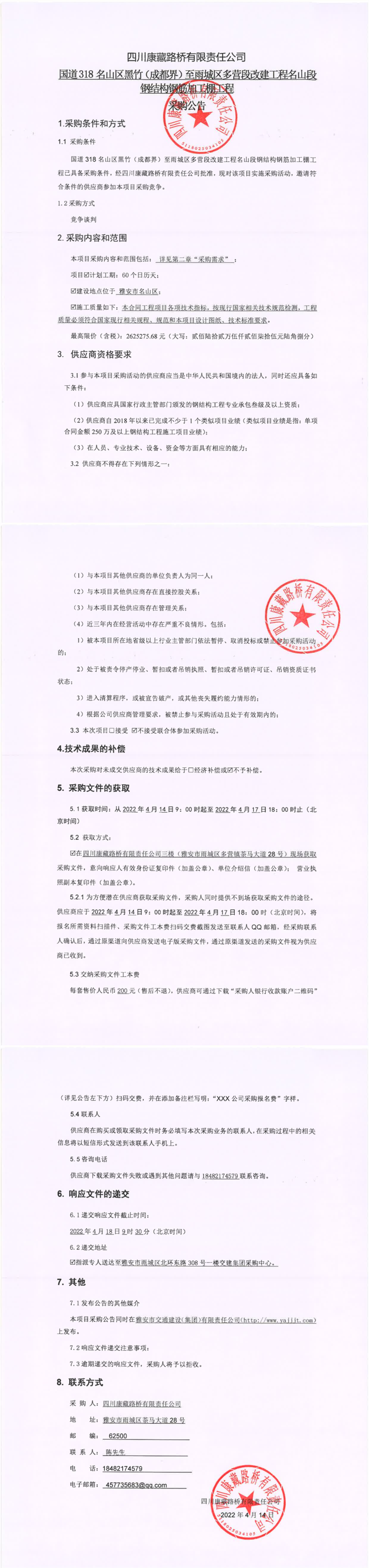 四川康藏路橋有限責(zé)任公司國道318名山區(qū)黑竹(成都界)至雨城區(qū)多營段改建工程名山段鋼結(jié)構(gòu)鋼筋加工棚工程采購公告
