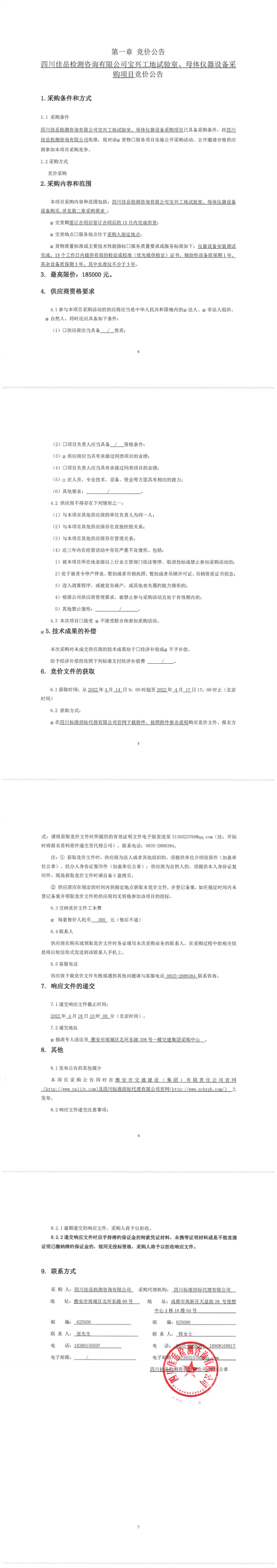 四川佳岳檢測咨詢有限公司寶興工地試驗室、母體儀器設(shè)備采購項目競價公告