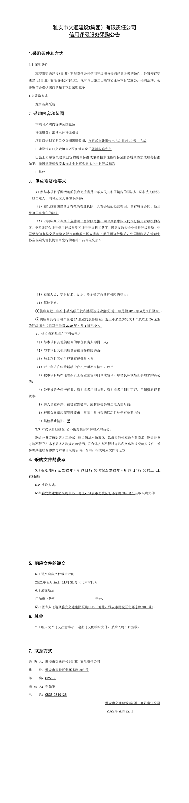 雅安市交通建設(shè)(集團(tuán))有限責(zé)任公司信用評(píng)級(jí)服務(wù)采購(gòu)公告