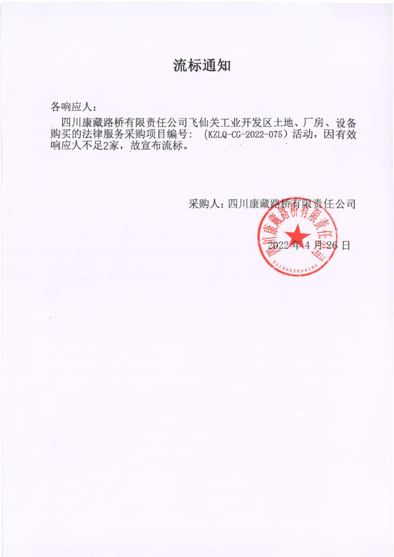 四川康藏路橋有限責(zé)任公司飛仙關(guān)工業(yè)開發(fā)區(qū)土地、廠房、設(shè)備購買的法律服務(wù)采購項(xiàng)目流標(biāo)通知