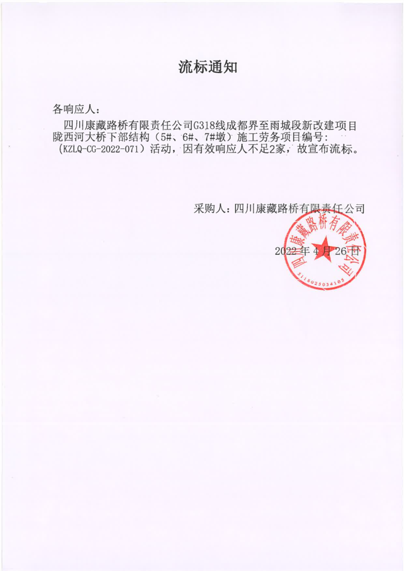 四川康藏路橋有限責任公司G318線成都界至雨城段新改建項目隴西河大橋下部結(jié)構(gòu)(5#、6#、7#墩)施工勞務(wù)采購流標通知