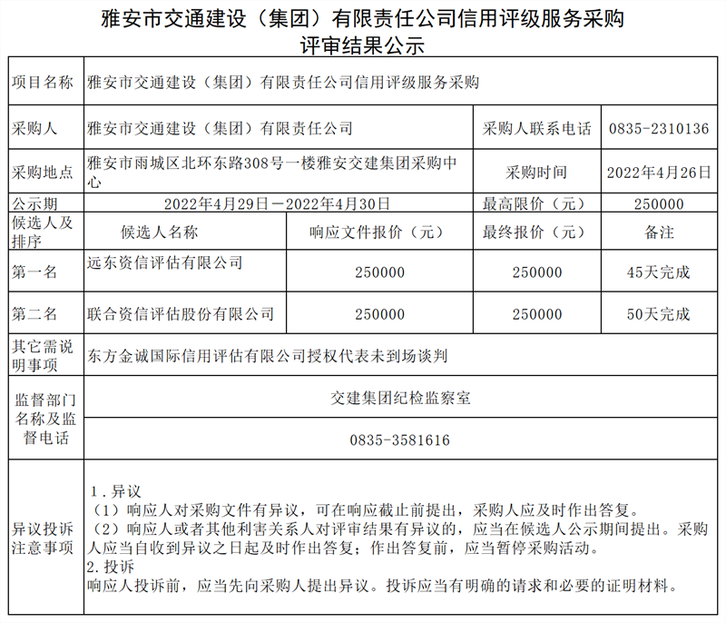 雅安市交通建設(shè)(集團(tuán))有限責(zé)任公司信用評級服務(wù)采購評審結(jié)果公示