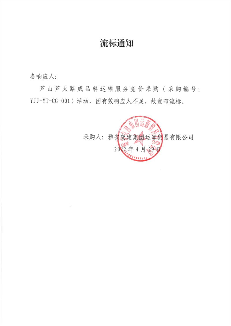 雅安交建集團(tuán)運(yùn)通貿(mào)易有限公司蘆山蘆太路成品料運(yùn)輸服務(wù)競價采購流標(biāo)通知