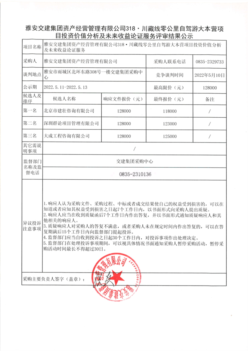 雅安交建集團資產(chǎn)經(jīng)營管理有限公司318·川藏線零公里自駕游大本營項目投資價值分析及未來收益論證服務評審結(jié)果公示