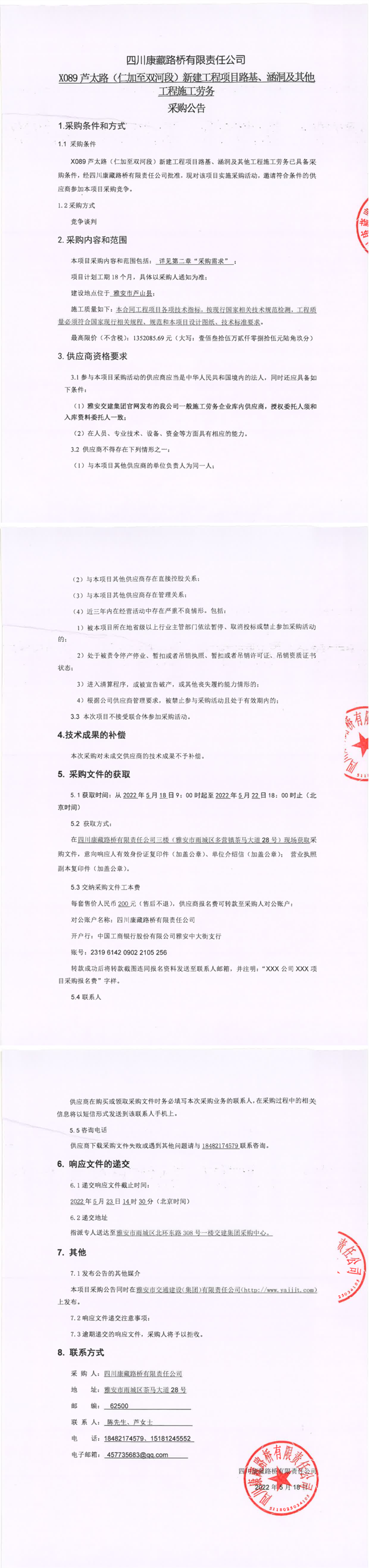 四川康藏路橋有限責任公司X089蘆太路(仁加至雙河段)新建工程項目路基、涵洞及其他工程施工勞務采購公告