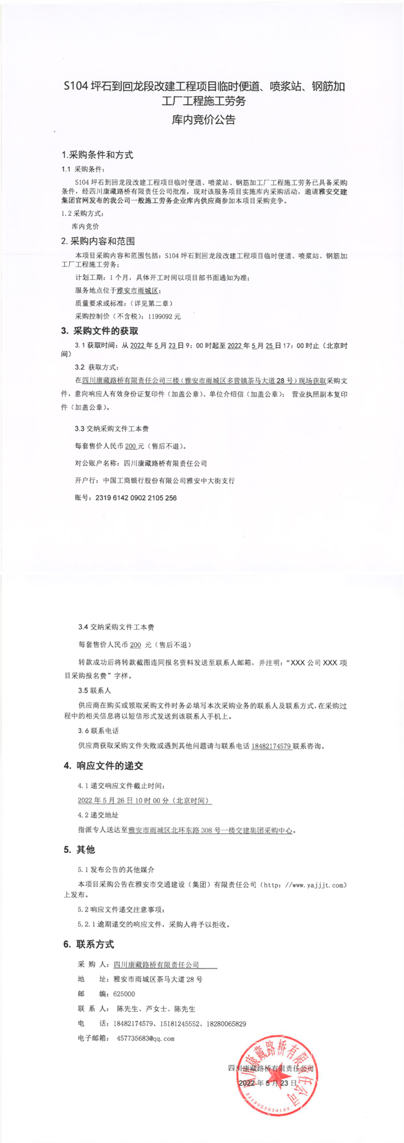 四川康藏路橋有限責(zé)任公司S104坪石到回龍段改建工程項(xiàng)目臨時(shí)便道、噴漿站、鋼筋加工廠工程施工勞務(wù)庫內(nèi)競價(jià)公告