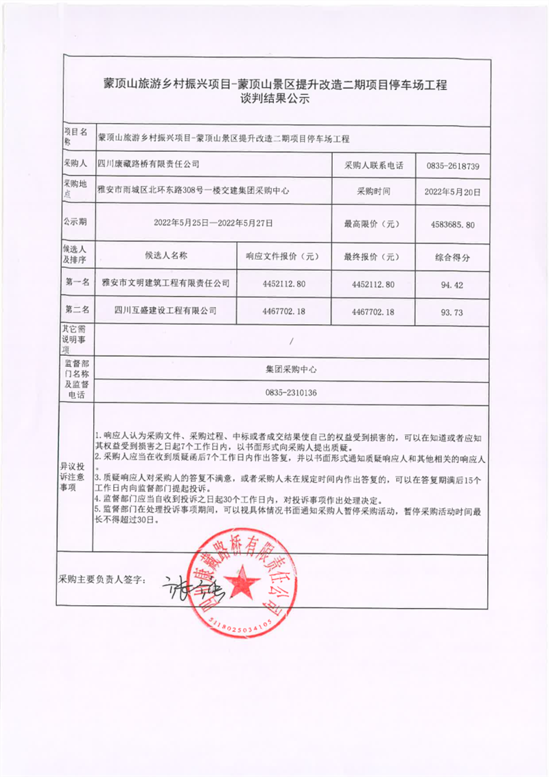 四川康藏路橋有限責(zé)任公司蒙頂山旅游鄉(xiāng)村振興項(xiàng)目-蒙頂山景區(qū)提升改造二期項(xiàng)目停車場(chǎng)工程談判結(jié)果公示