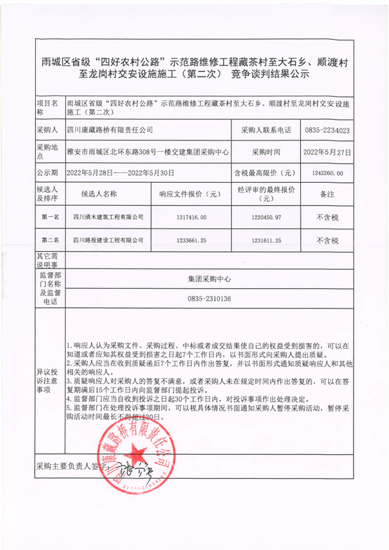 四川康藏路橋有限責(zé)任公司雨城區(qū)省級“四好農(nóng)村公路”示范路維修工程藏茶村至大石鄉(xiāng)、順渡村至龍崗村交安設(shè)施施工(第二次)競爭談判結(jié)果公示
