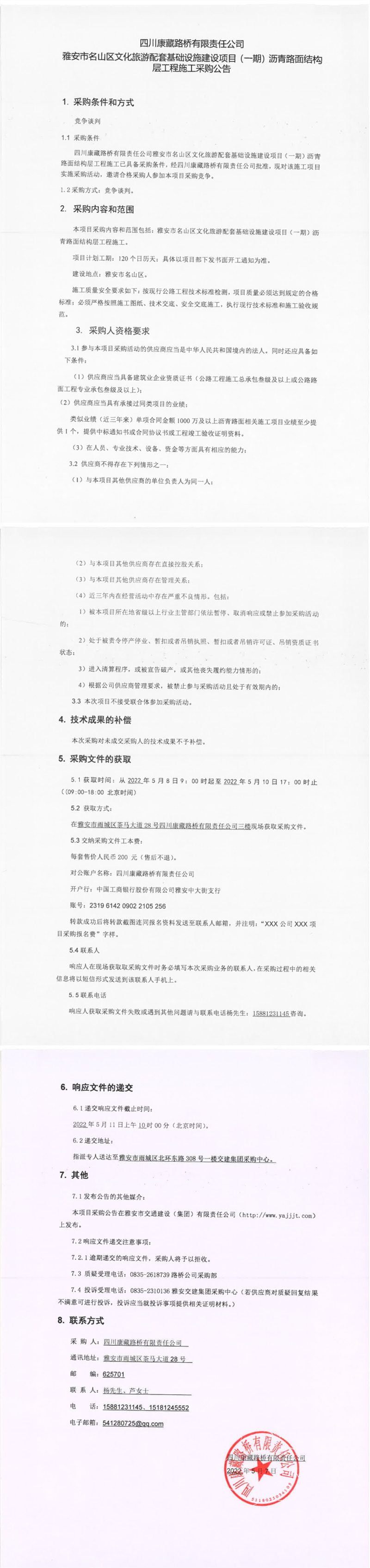 四川康藏路橋有限責任公司雅安市名山區(qū)文化旅游配套基礎設施建設項目(一期)瀝青路面結構層工程施工采購公告