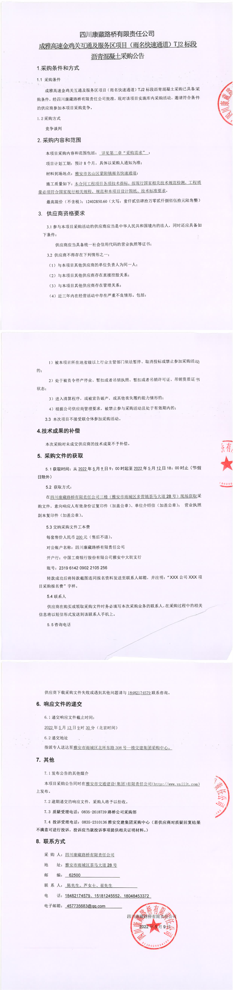 四川康藏路橋有限責(zé)任公司成雅高速金雞關(guān)互通及服務(wù)區(qū)項目(雨名快速通道)TJ2標(biāo)段瀝青混凝土采購公告