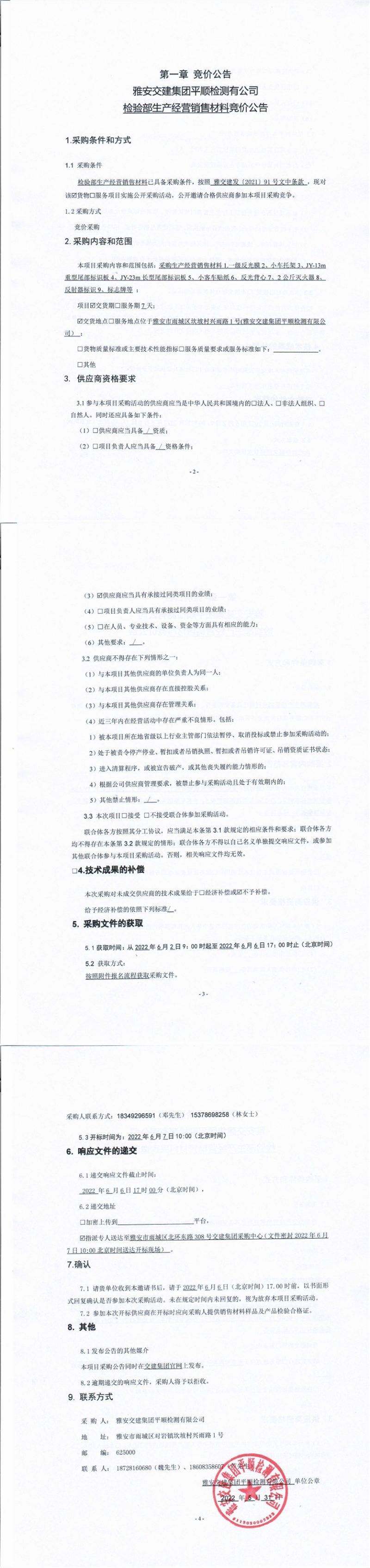 雅安交建集團(tuán)平順檢測(cè)有限公司檢驗(yàn)部生產(chǎn)經(jīng)營(yíng)銷(xiāo)售材料競(jìng)價(jià)公告