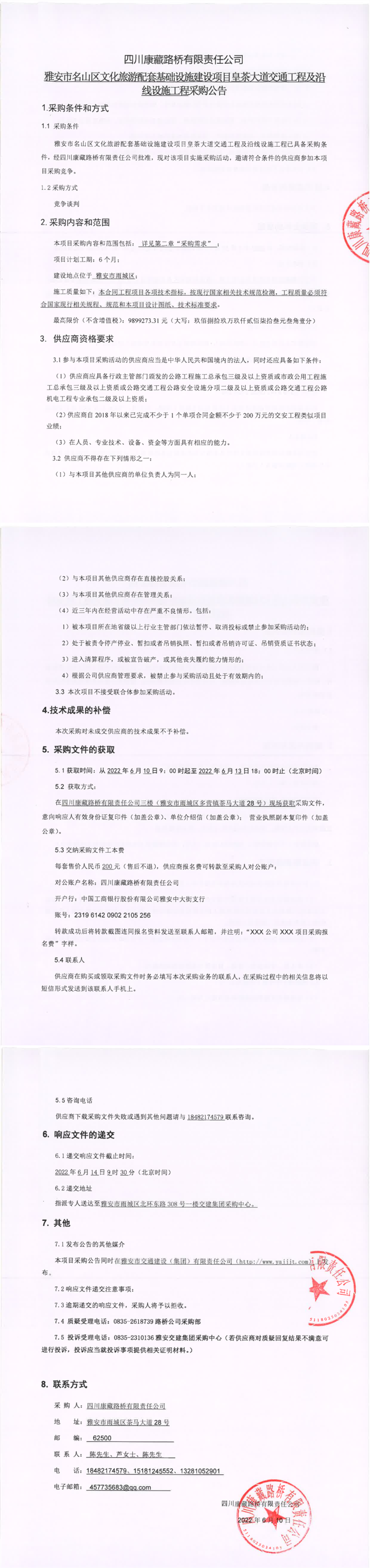 四川康藏路橋有限責任公司雅安市名山區(qū)文化旅游配套基礎設施建設項目皇茶大道交通工程及沿線設施工程采購公告