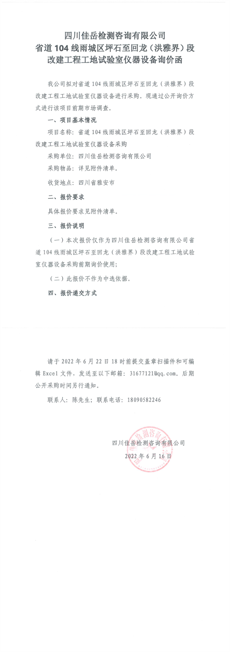四川佳岳檢測咨詢有限公司省道104線雨城區(qū)坪石至回龍(洪雅界)段改建工程工地試驗(yàn)室儀器設(shè)備詢價函