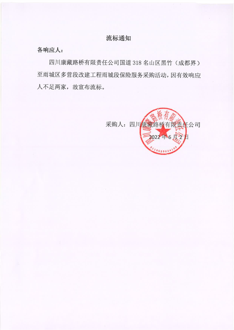 四川康藏路橋有限責任公司國道318名山區(qū)黑竹(成都界)至雨城區(qū)多營段改建工程雨城段保險服務采購流標通知