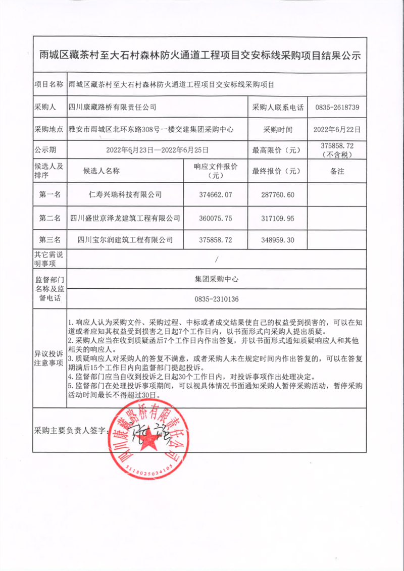 四川康藏路橋有限責任公司雨城區(qū)藏茶村至大石村森林防火通道工程項目交安標線采購項目結(jié)果公示
