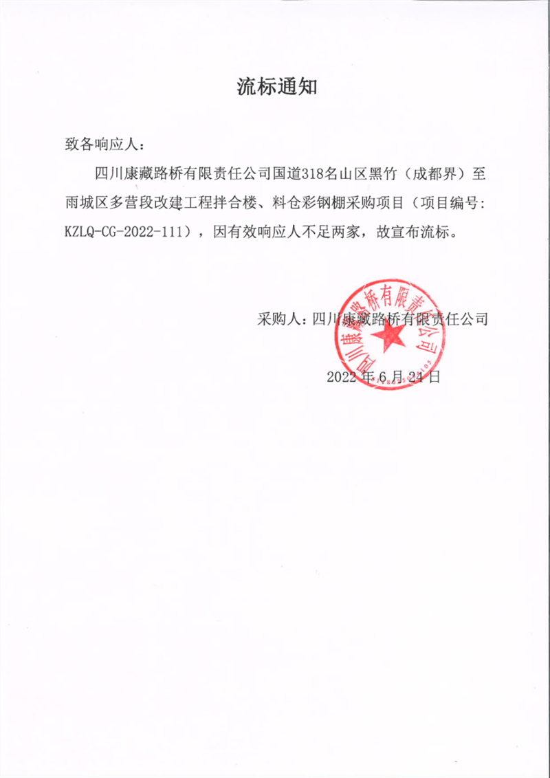 四川康藏路橋有限責(zé)任公司國道318名山區(qū)黑竹(成都界)至雨城區(qū)多營段改建工程拌合樓、料倉彩鋼棚采購項(xiàng)目流標(biāo)通知