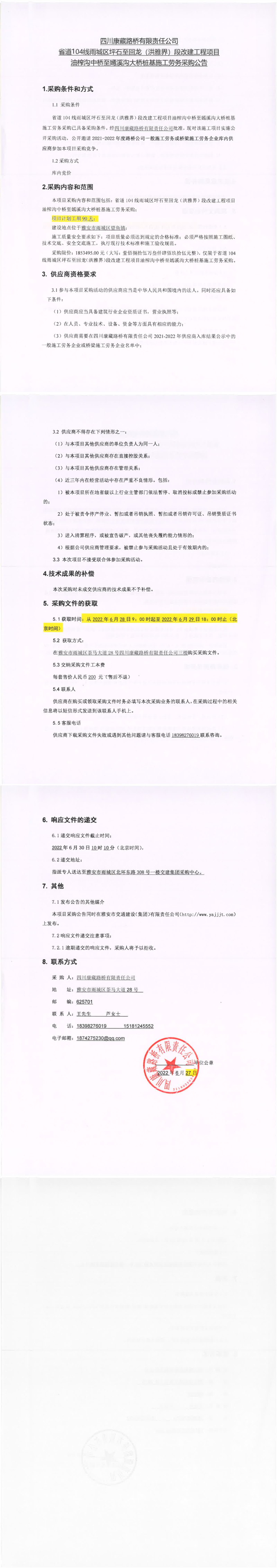 四川康藏路橋有限責(zé)任公司省道104線雨城區(qū)坪石至回龍(洪雅界)段改建工程項目錢壩大橋、望魚大橋樁基及鋼便橋工程施工勞務(wù)采購公告