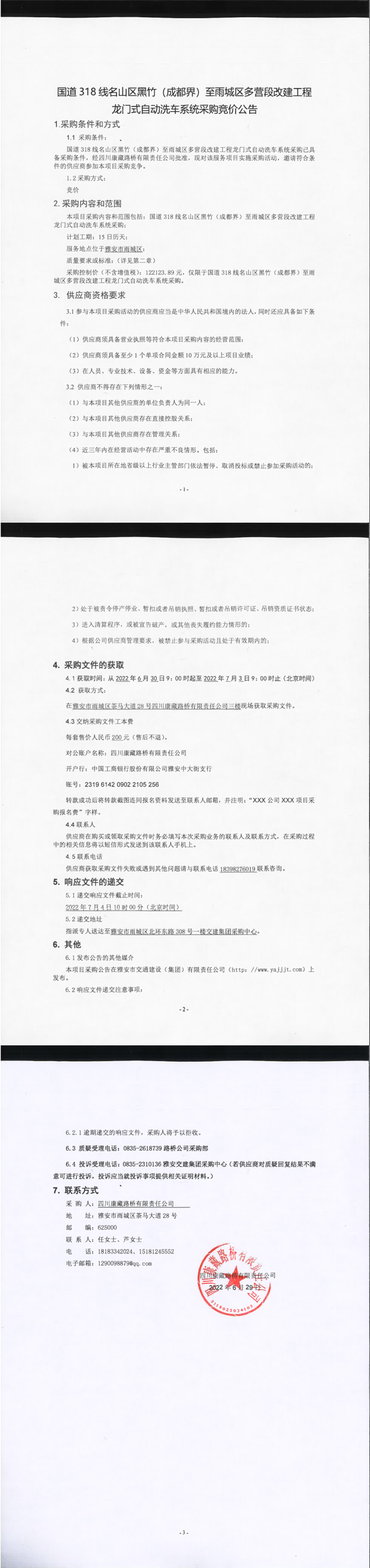 四川康藏路橋有限責(zé)任公司國(guó)道318線名山區(qū)黑竹(成都界)至雨城區(qū)多營(yíng)段改建工程龍門式自動(dòng)洗車系統(tǒng)采購(gòu)競(jìng)價(jià)公告