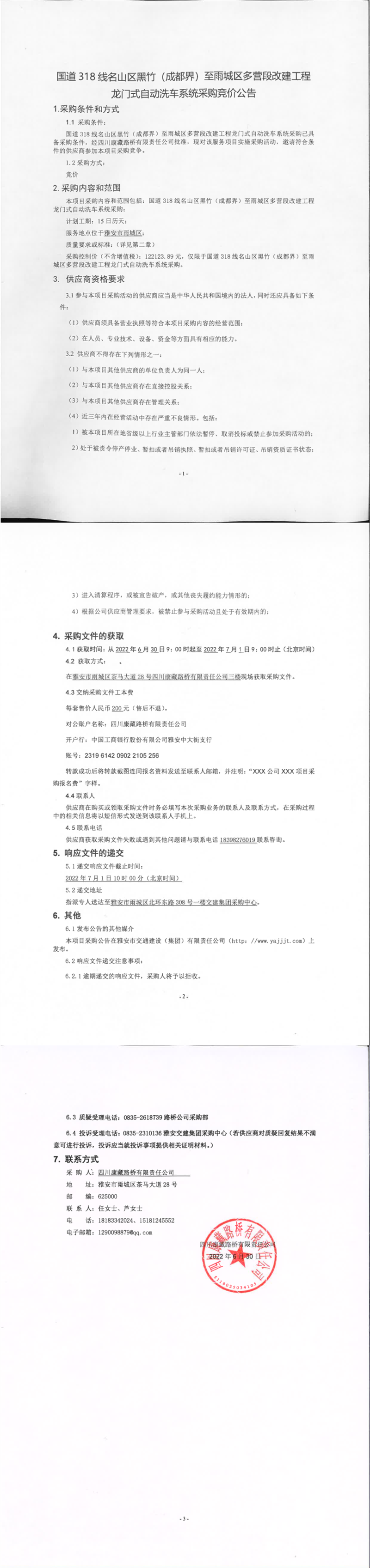 四川康藏路橋有限責(zé)任公司國(guó)道318名山區(qū)黑竹(成都界)至雨城區(qū)多營(yíng)段改建工程龍門(mén)式自動(dòng)洗車系統(tǒng)采購(gòu)競(jìng)價(jià)公告