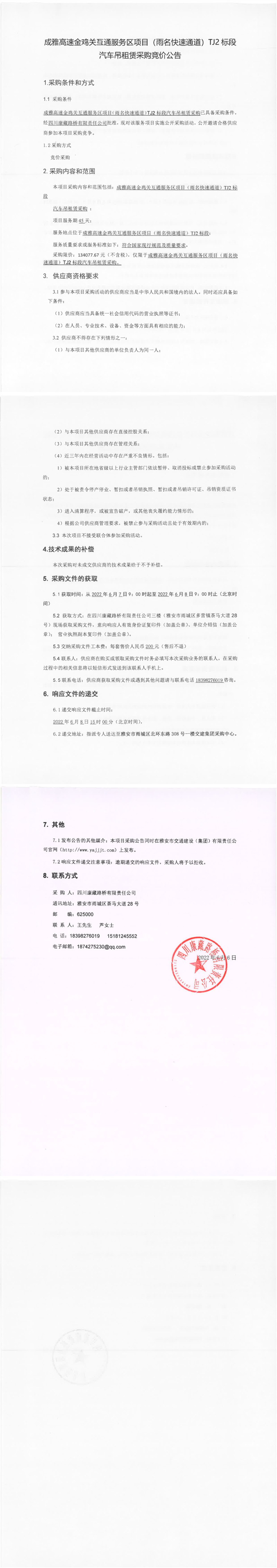 四川康藏路橋有限責(zé)任公司成雅高速金雞關(guān)互通服務(wù)區(qū)項(xiàng)目(雨名快速通道)TJ2標(biāo)段汽車吊租賃采購(gòu)競(jìng)價(jià)公告