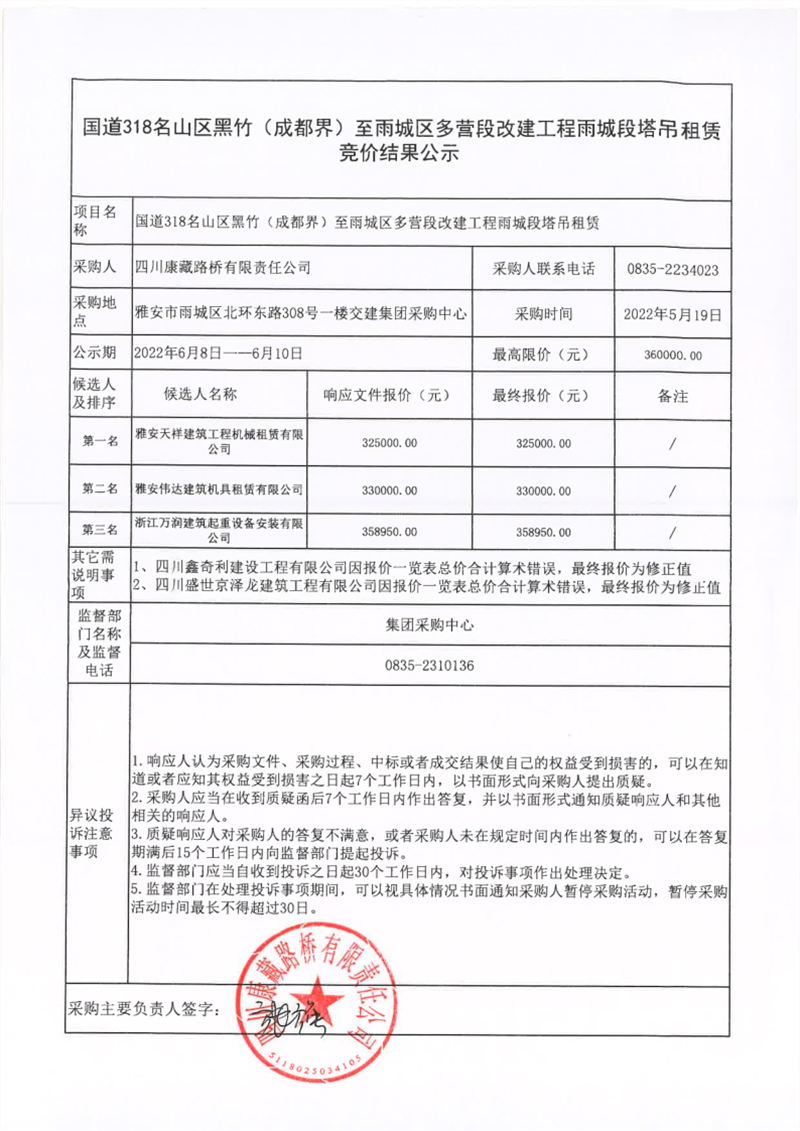 四川康藏路橋有限責任公司國道318名山區(qū)黑竹(成都界)至雨城區(qū)多營段改建工程雨城段塔吊租賃競價結果公示