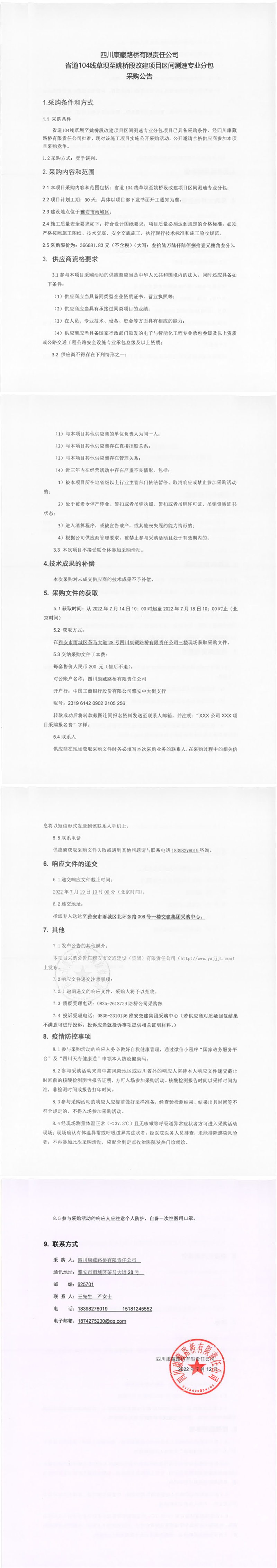 四川康藏路橋有限責(zé)任公司省道104線草壩至姚橋段改建項(xiàng)目區(qū)間測(cè)速專業(yè)分包采購公告
